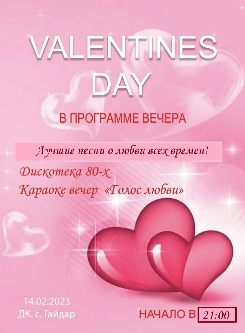 В День Влюблённых, присоединяйтесь к нам на незабываемую дискотеку 80-х, которая пройдёт 14 февраля в ДК села Гайдар, начало в 21.00! Отпразднуйте вместе с нами стильные и яркие годы, окунитесь в атмосферу ностальгии и танцев до утра! Вас ждет захватывающая программа с караоке, чтобы вспомнить любимые хиты и исполнить их вместе. Не упустите шанс погрузиться в мир 80-х вместе с нами!