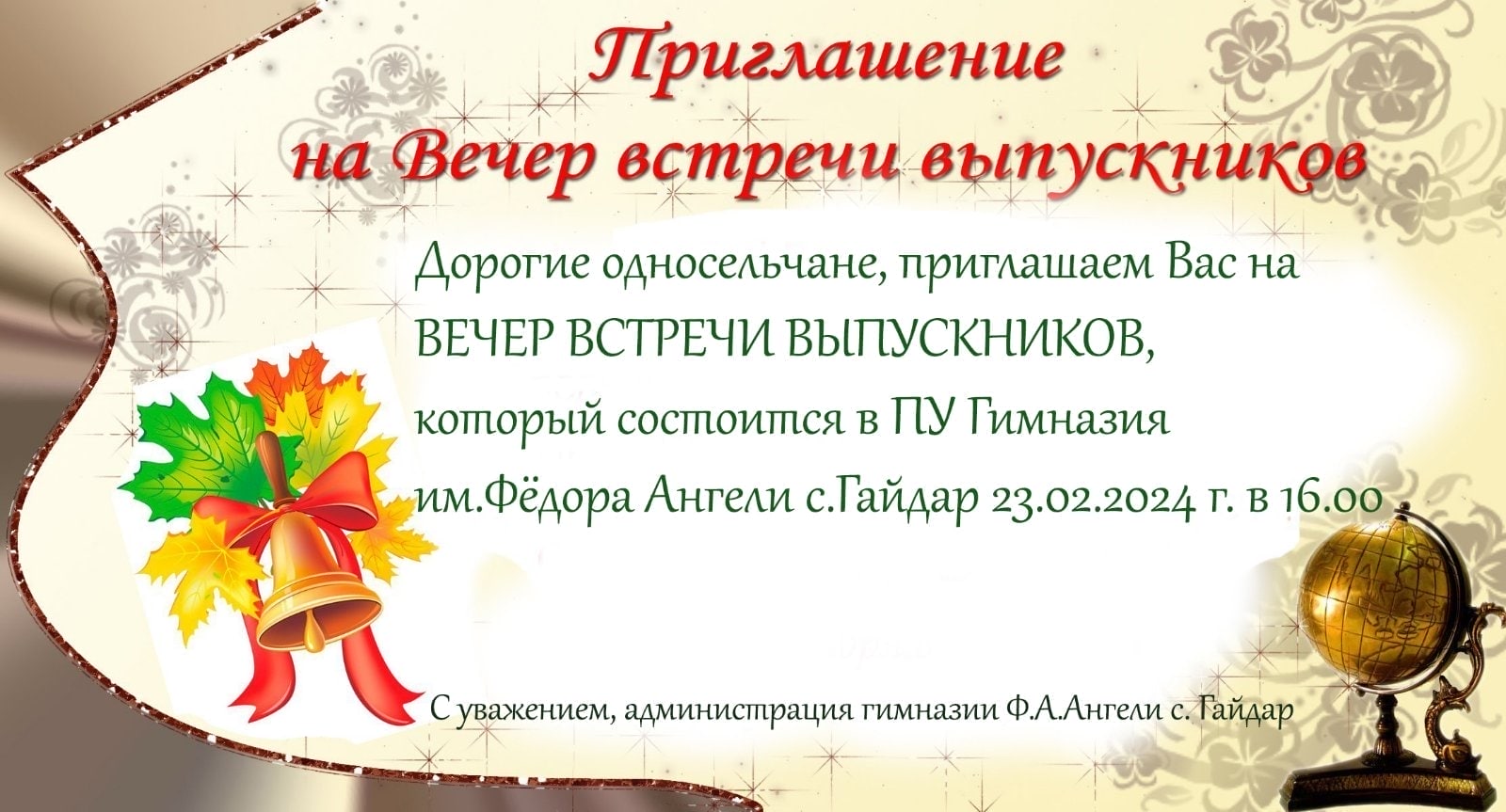 Главная Анонсы Дорогие односельчане, приглашаем Вас на Вечер встречи выпускников!АнонсыОбъявленияДорогие односельчане, приглашаем Вас на Вечер встречи выпускников! 20.02.202470 Facebook Twitter OK Linkedin Viber WhatsApp РаспечататьСХОЖИЕ СТАТЬИБОЛЬШЕ ОТ АВТОРАУважаемые жители села Гайдар!Уважаемые жители и гости села Гайдар!Уважаемые жители с. Гайдар. Субботник был успешно проведен!Последние статьиУважаемые жители села Гайдар! 21.04.2026Уважаемые жители и гости села Гайдар! 18.04.2026Уважаемые жители с. Гайдар. Субботник был успешно проведен! 08.04.2026
