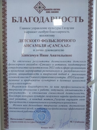 В г. Комрат состоялось отчетное собрание Главного управления культуры Гагаузии о проведенной работе за 2022 год. Поздравляем Капсамун Нину Анатольевну и детский фольклорный ансамбль «Çancaaz» с наградой и благодарим за вклад в развитие культуры села Гайдар.