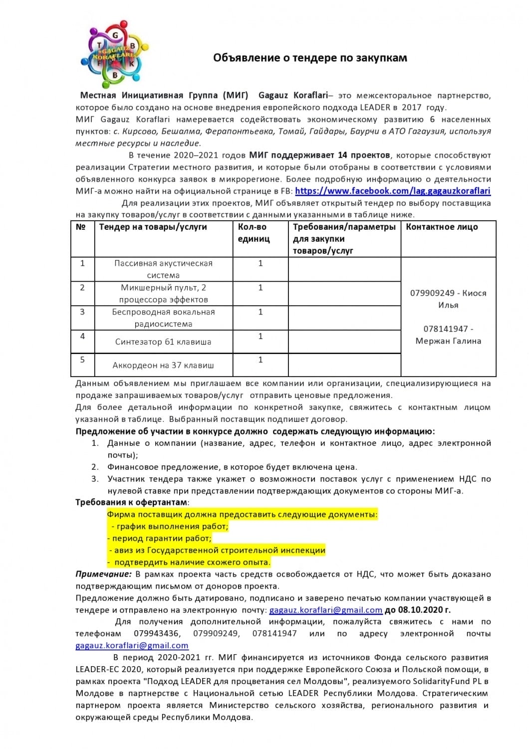 Главная Объявления Объявление о тендере по закупкам для проекта «Музыкальное развитие молодого поколения села...ОбъявленияОбъявление о тендере по закупкам для проекта «Музыкальное развитие молодого поколения села Гайдар» 01.10.2020154 Facebook Twitter OK Linkedin Viber WhatsApp РаспечататьСХОЖИЕ СТАТЬИБОЛЬШЕ ОТ АВТОРАУважаемые жители села Гайдар!Уважаемые жители и гости села Гайдар!Уважаемые жители с. Гайдар. Субботник был успешно проведен!
