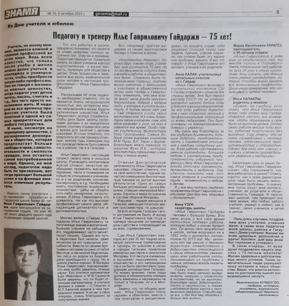 Учитель является важной и главной профессией во всем мире. И недаром во все времена профессия учителя была почетной и одной из самых приоритетных для любого государства. Однако, педагогом надо быть по призванию, вот тогда приходит большой успех и на финише имеются отличные результаты. Именно таким учителем — по призванию — проработал в Гайдарской школе более 40 лет Илья Гаврилович Гайдаржи , ныне находящийся на заслуженном отдыхе. Из этих 40 лет около двадцати одного года он руководил средней школой.