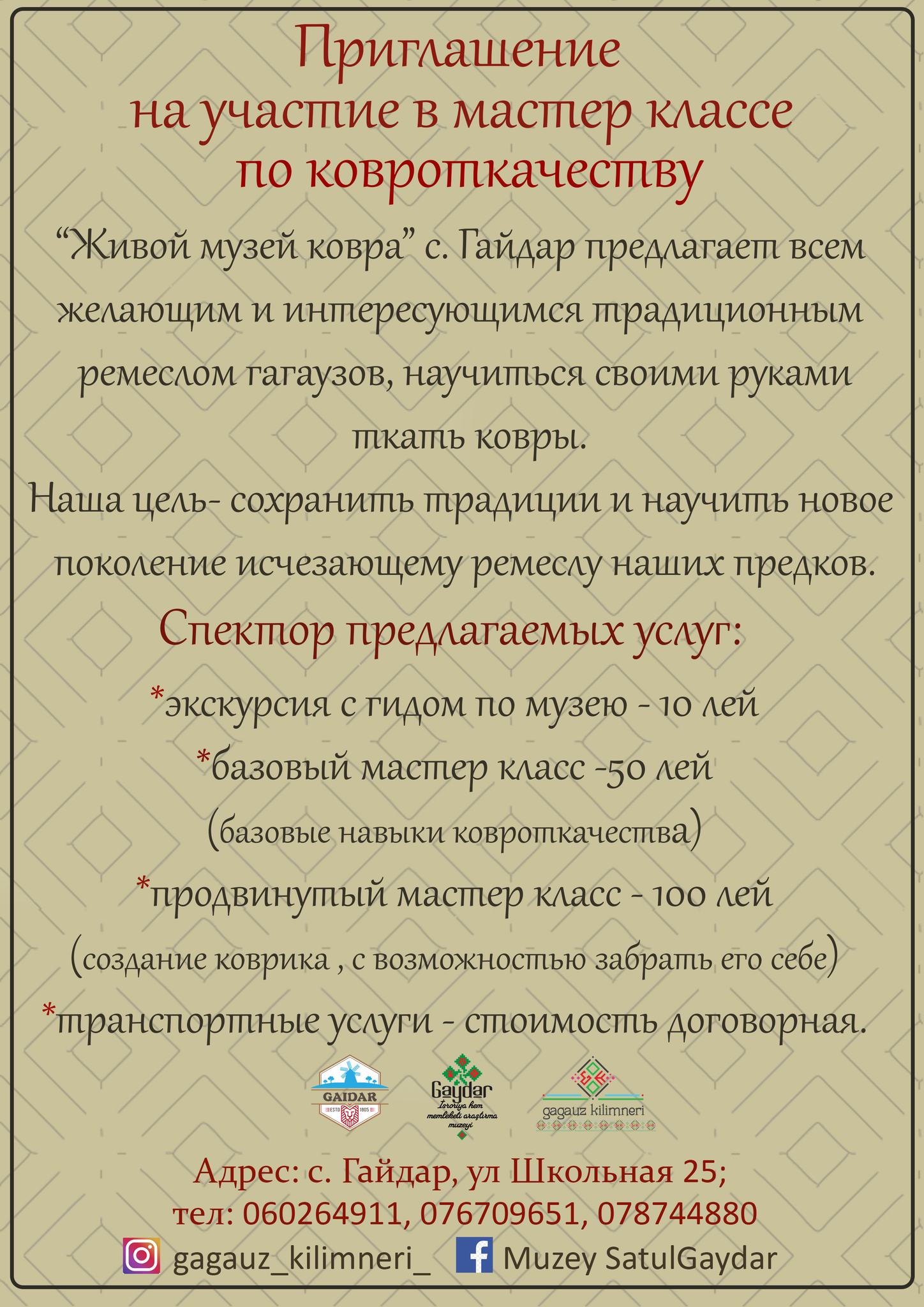 Главная Анонсы Приглашение на участие в мастер классе по ковроткачествуАнонсыОбъявленияПриглашение на участие в мастер классе по ковроткачеству 05.04.20247 Facebook Twitter OK Linkedin Viber WhatsApp РаспечататьСХОЖИЕ СТАТЬИБОЛЬШЕ ОТ АВТОРАУважаемые жители села Гайдар!Уважаемые жители и гости села Гайдар!Уважаемые жители с. Гайдар. Субботник был успешно проведен!Последние статьиУважаемые жители села Гайдар! 21.04.2026Уважаемые жители и гости села Гайдар! 18.04.2026Уважаемые жители с. Гайдар. Субботник был успешно проведен! 08.04.2026
