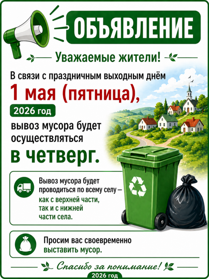 На текущей неделе в связи с праздничным выходным днём 1 мая — пятница, вывоз мусора будет осуществляться в четверг!