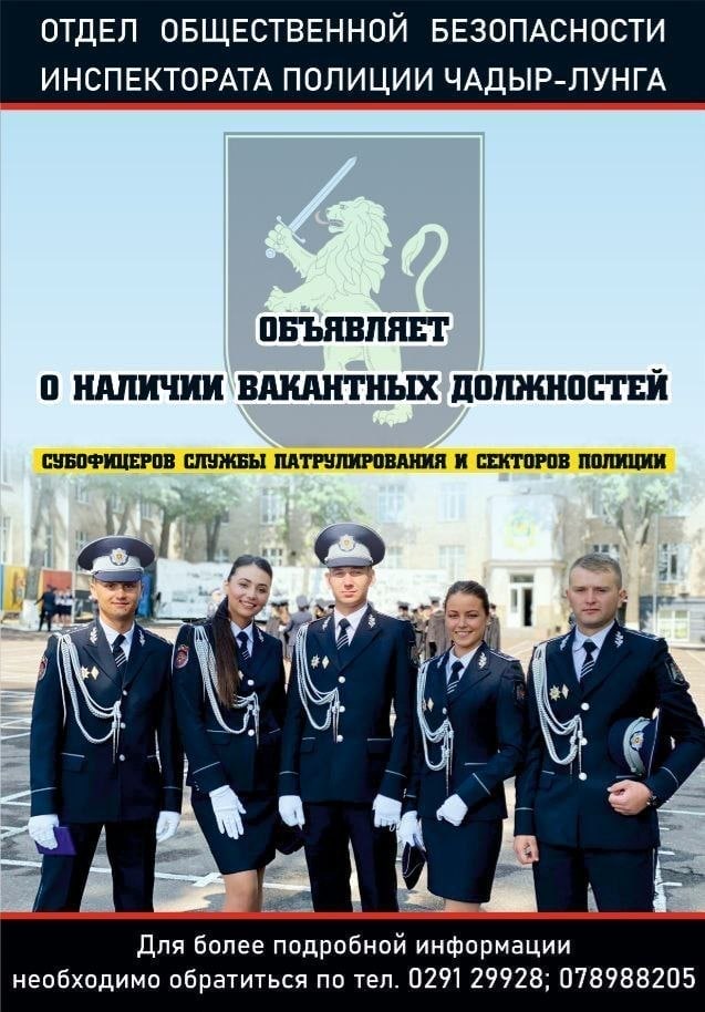 Главная Анонсы В полиции набирают сотрудников: на какие должности требуются людиАнонсыОбъявленияВ полиции набирают сотрудников: на какие должности требуются люди 04.03.202443 Facebook Twitter OK Linkedin Viber WhatsApp Вы с детства мечтали стать полицейским — настал тот момент : В ряды отдела полиции г. Чадыр-Лунга приглашают граждан. РаспечататьСХОЖИЕ СТАТЬИБОЛЬШЕ ОТ АВТОРАУважаемые жители села Гайдар!Уважаемые жители и гости села Гайдар!Уважаемые жители с. Гайдар. Субботник был успешно проведен!Последние статьиУважаемые жители села Гайдар! 21.04.2026Уважаемые жители и гости села Гайдар! 18.04.2026Уважаемые жители с. Гайдар. Субботник был успешно проведен! 08.04.2026