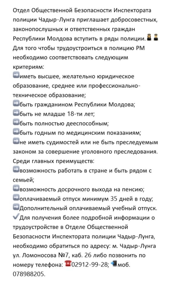 Главная Анонсы Вы с детства мечтали стать полицейским — настал тот момент : В...АнонсыОбъявленияВы с детства мечтали стать полицейским — настал тот момент : В ряды отдела полиции г. Чадыр-Лунга приглашают граждан 17.10.202387 Facebook Twitter OK Linkedin Viber WhatsApp РаспечататьСХОЖИЕ СТАТЬИБОЛЬШЕ ОТ АВТОРАУважаемые жители с. Гайдар. Субботник был успешно проведен!Дорогие жители села Гайдар!Уважаемые жители с. Гайдар. Сессия местного совета назначенная на 6 апреля 2026 года не состоялась!Последние статьиУважаемые жители с. Гайдар. Субботник был успешно проведен! 08.04.2026Дорогие жители села Гайдар! 07.04.2026Уважаемые жители с. Гайдар. Сессия местного совета назначенная на 6 апреля... 06.04.2026